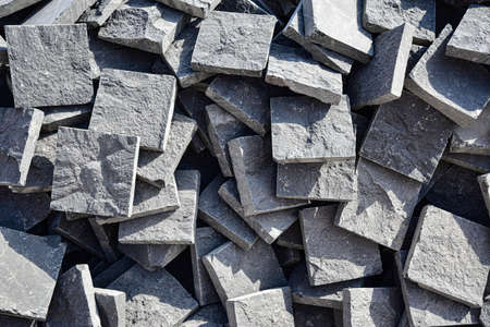 Close view of a pile of grey concrete cobblestones