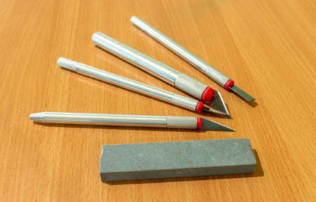 Various sharp precision craft knives with different blades and sharpening stone on a lacquered wooden surface