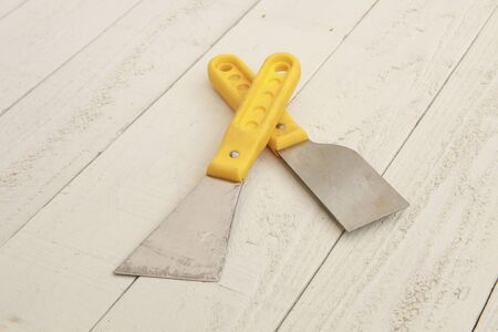 putty knife and two paint scrapers on vintage wood.