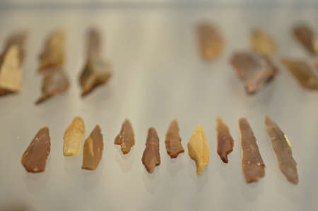 Collection of various stone arrowheads arranged on a light background showcasing different colors and textures. Archaeological and historical concept.
