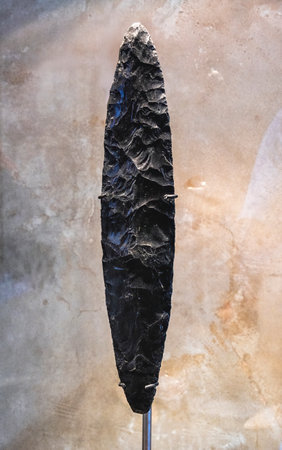 Primitive stone spearhead on dark slate background
