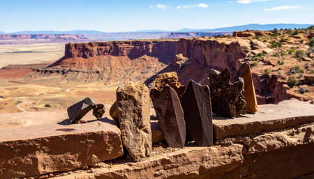 A collection of rock climbing pitons rests on a sun-drenched sandstone ledge overlooking a vast desert canyon. This display represents the history of mountaineering, a tribute to the generations of climbers who have challenged these formidable cliffs, symbolizing preparation, tradition, and the enduring spirit of adventure.