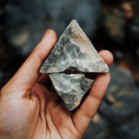 A person holds two distinct quartz crystal fragments with clear geometrics against a blurred natural background showcasing their beauty.