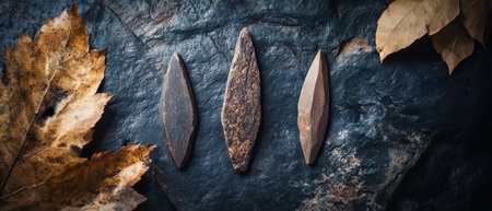 Three ancient stone tools rest on a dark stone surface surrounded by fallen autumn leaves showcasing historical craftsmanship.