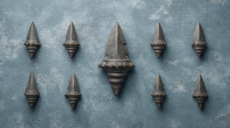 A collection of decorative metal spikes displayed against a textured blue-gray background, highlighting craftsmanship and unique design, perfect for architectural inspiration.