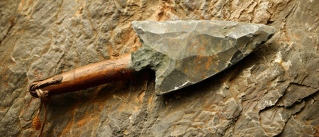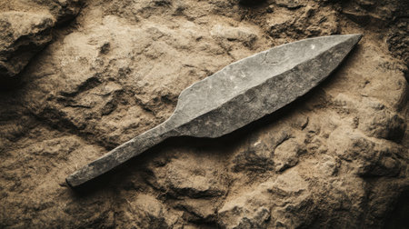 This image showcases an ancient stone tool resting on a rugged brown surface, highlighting its sharp edge and intricate craftsmanship, perfect for historical contexts.