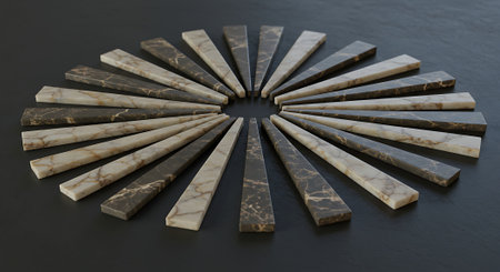 A high-angle shot showcasing a circular arrangement of numerous weathered stone wedges, each displaying unique textures and shades of gray, against a contrasting dark background.