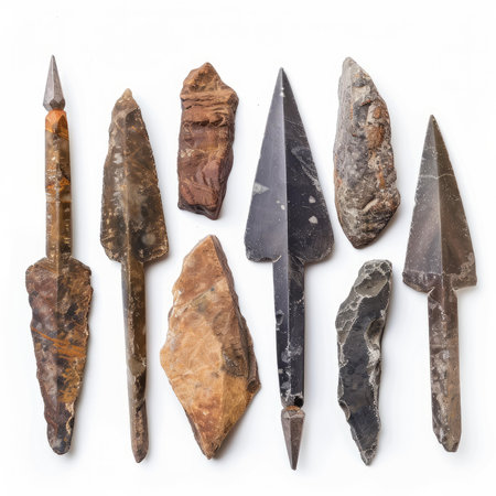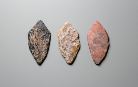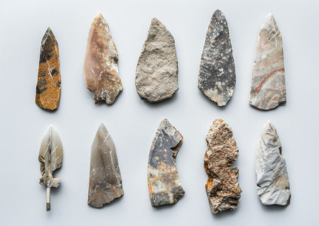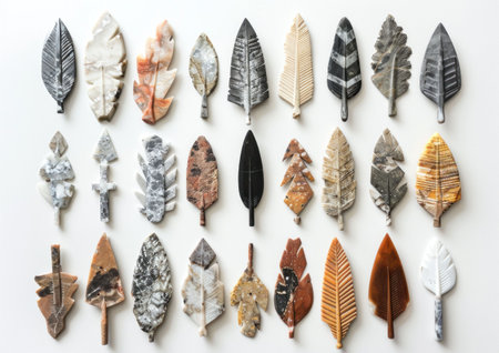 Unique collection of ancient stone arrowheads arranged on a neutral background, showcasing various colors and patterns. Historical artifact concept.