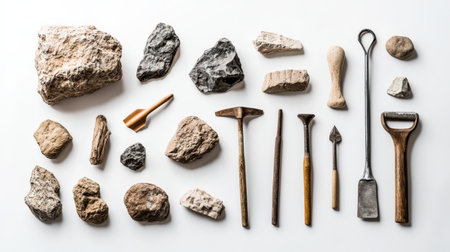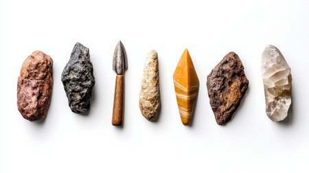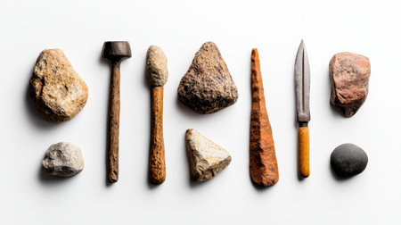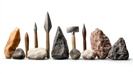 A collection of various rocks and tools, such as a hammer and a spear, are lined up next to each other. The arrangement of the items creates a sense of order and organization