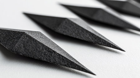 This image showcases a series of black, metallic objects with sharp, triangular points. Arranged in a line, the objects are set against a plain white background. The composition highlights texture and form with its strong shadows and focused perspective. Suitable for design, abstract concepts, or use in visual marketing materials.