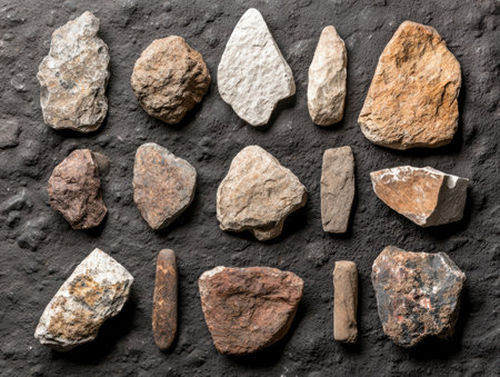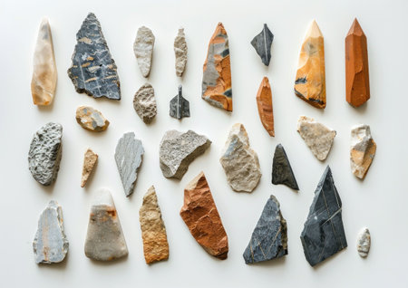 Collection of various stone tools arranged neatly on a light gray background Each stone exhibits unique textures and colors