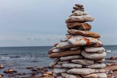 Pyramid made of gray oval stones on the beach