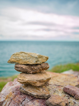 Close up picture of a stone cairn outdoors. Ocean in the blurry background
