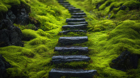 A serene pathway lined with stone steps leads through a vibrant moss-covered landscape, inviting exploration and reflection in nature's tranquility.