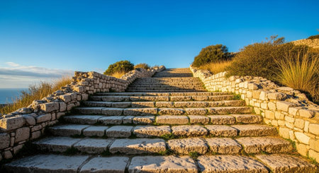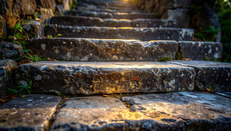 Weathered by time, these ancient stone steps ascend towards a warm, golden light, inviting one on a journey of discovery. Each step holds a story of the past, leading to an unknown, hopeful future.