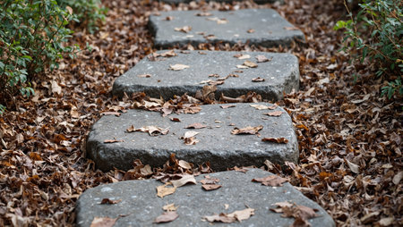 Scattered dry leaves on stepping stones in a garden path