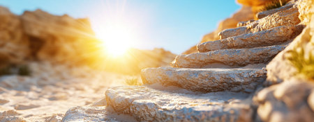 Stunning stone steps lead up sandy path, illuminated by bright sunrise.
