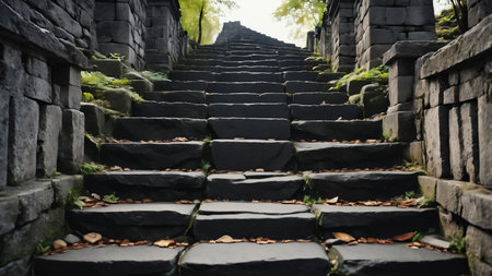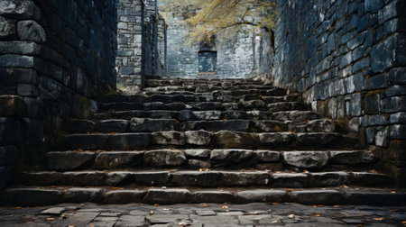 Ancient stone stairs and walls. View from bottom to top, AI Generated.