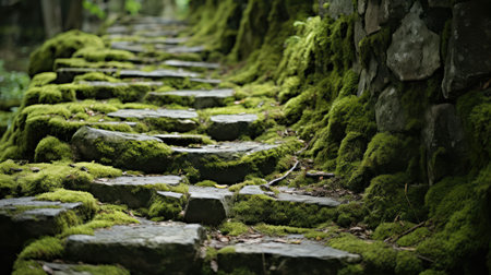Stone steps covered in moss lush, green forest