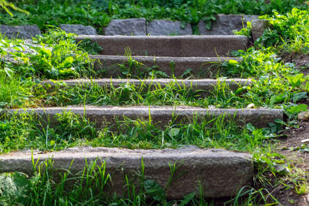 Old stone steps overgrown with green grass under the bright sun