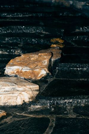 Stones on the path to the pond in the garden. Selective focus. Shallow depth of field. Toned.