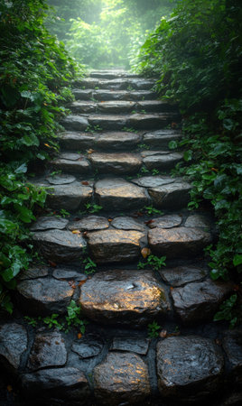Worn stone steps lead upward, surrounded by vibrant greenery and soft mist. The atmosphere is serene, inviting exploration into nature's embrace.