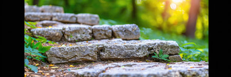 A beautiful winding stone pathway glimmers under the warm glow of a sunset, inviting viewers to experience the tranquility of nature