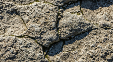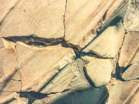 broken road made of natural stone. beige color texture, natural material. concrete slabs with cracks, broken road.