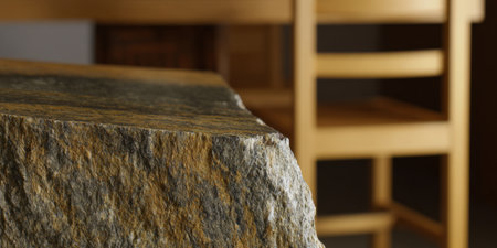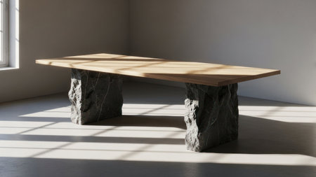 A modern wooden table rests on two stone bases, creating a striking contrast of textures. The table is placed in an indoor setting with natural light streaming through a window. The composition emphasizes simplicity and minimalist design, highlighted by the neutral color palette.