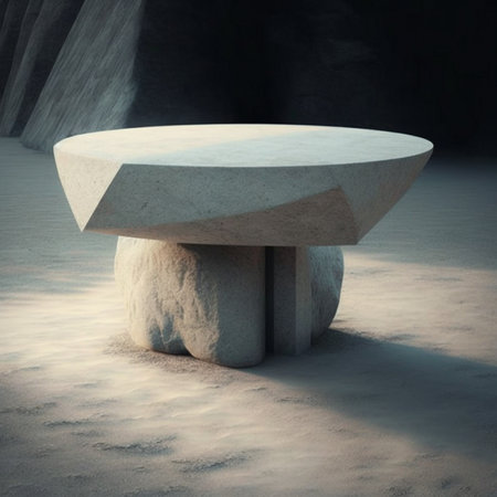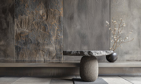 A minimalist granite pedestal on a slate tabletop with a textured sandstone backdrop
