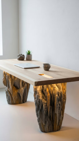 A wooden desk sits in a well-lit interior. The desk features a natural wood surface supported by textured stone legs. Warm lighting illuminates the underside of the tabletop. Decorative items like a small plant and a cup adorn the surface.