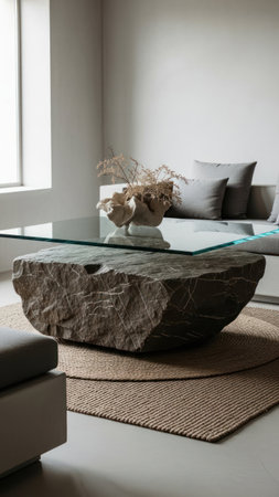 A living room showcases a large stone coffee table as its focal point. The minimalist design incorporates neutral tones, including white walls and gray furnishings. The arrangement features a sofa, rug, and decorative elements creating a serene atmosphere. Natural light illuminates the interior space.