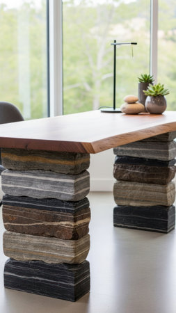 A contemporary desk features a light wooden surface supported by stacked stone block legs. The interior setting receives ample daylight, enhancing the textures of the desk. Simple decor adds detail to the workspace, creating a fresh, stylish design suitable for work.
