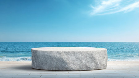 AI Generated. White stone podium with beach background Minimal scene podium for product presentation or advertising