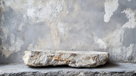 Weathered stone tabletop set against a grey, textured concrete wall creating a rustic aesthetic, perfect for product display, evoking history and character.