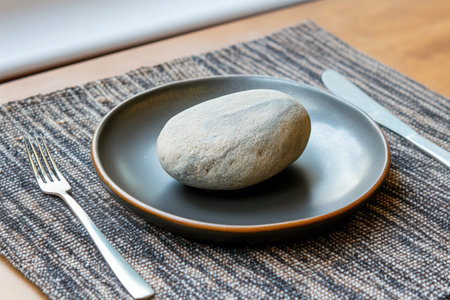 stone on white plate with spoon and fork on wooden table