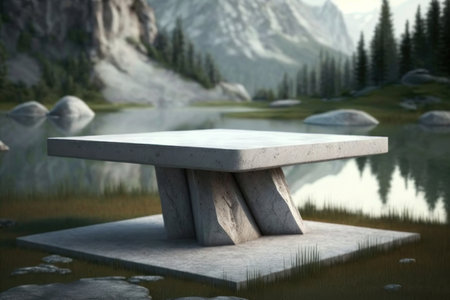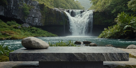 AI Generated. Podium product display blends into nature with stone table on waterfall background