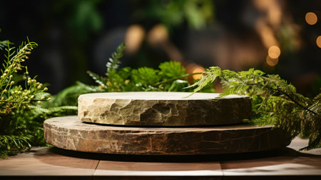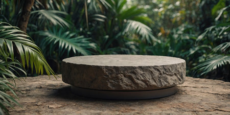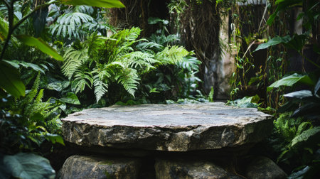 Rustic rock platform in an untouched jungle paradise, vines and ferns framing the pedestal generative ai