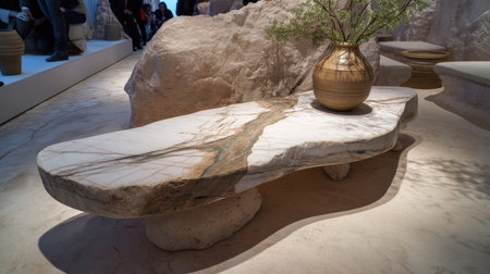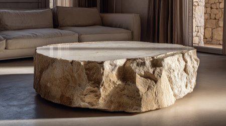 A large, irregularly shaped stone coffee table dominates the foreground, set against a modern living room. The natural color of the stone contrasts with the beige sofa and sunlit environment. The image composition suggests a luxurious, minimalist aesthetic, suitable for interior design and lifestyle content.