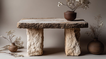 A beautifully arranged rustic table featuring stone legs and simple pottery. Soft floral elements enhance the natural aesthetic. Perfect for interior design inspiration.