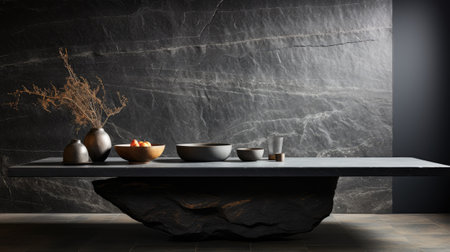 Professional design background with expensive black granite. Dark stone table with elements. High quality illustration