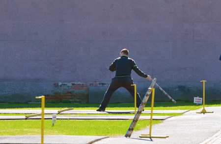 Saint-Petersburg.Russia. May.06.2018.Gorodki - a Russian folk sports game. In this game you need specific distances to smash figures made in different ways from five wooden cylinders.