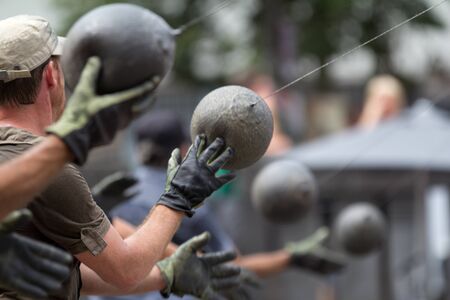 AURILLAC, FRANCE - AUGUST 24: heavy balls are held by four strong men as part of the Aurillac International Street Theater Festival, show named New town, on august 24, 2012, in Aurillac,France.