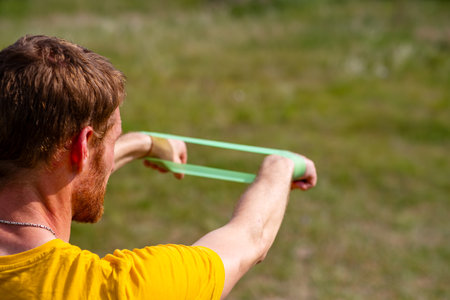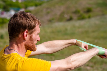 A professional sportsman in a yellow shirt is holding a Elastic band expander. He appears focused and determined as he prepares his shoulder and arm muscles for the workout ahead