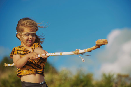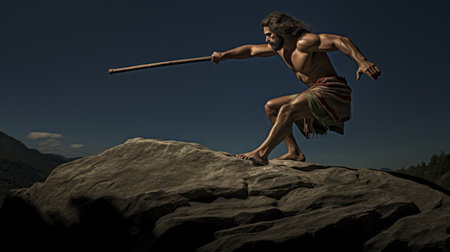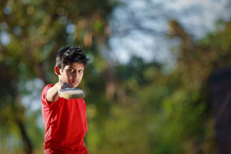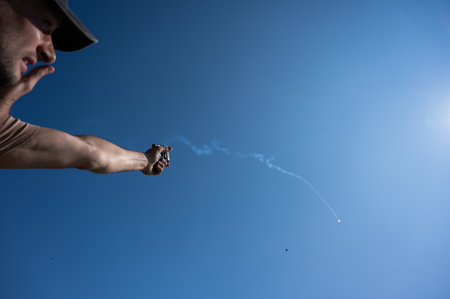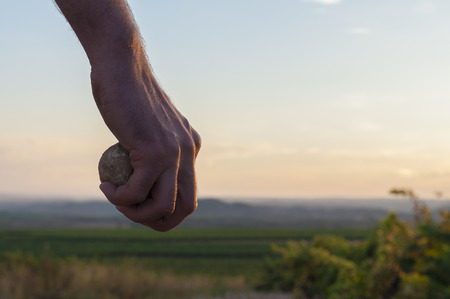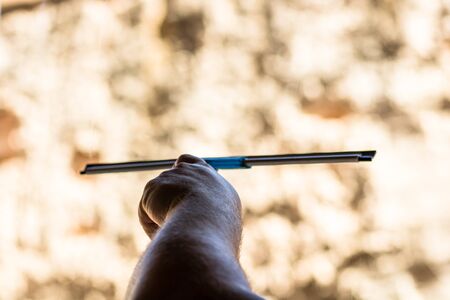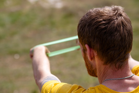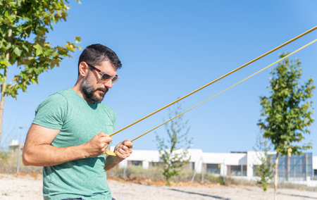 Close up man playing slingshot or catapult in morning time with sunlight effect