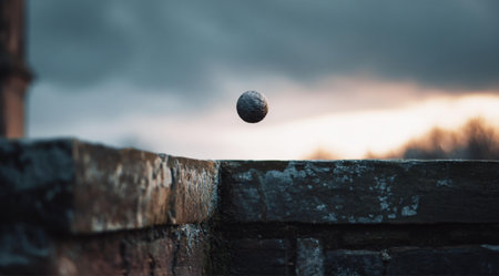 A stone wall with a ball in front of a cloudy sky. A closeup shot of a ball fly on a stone wall under a cloudy sky