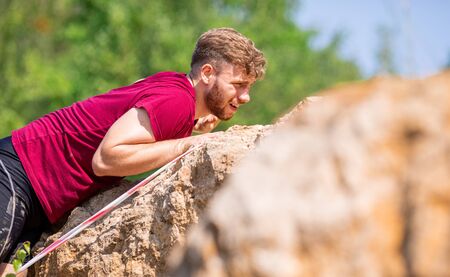 Runner climbing on rocks obstacles in the extreme cross-country race