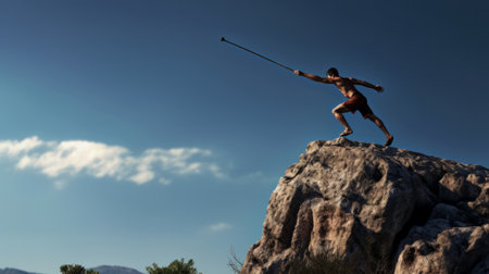 Athlete standing on grassy field holding javelin and preparing for throw, captured in dynamic pose under clear sky
