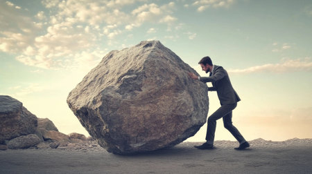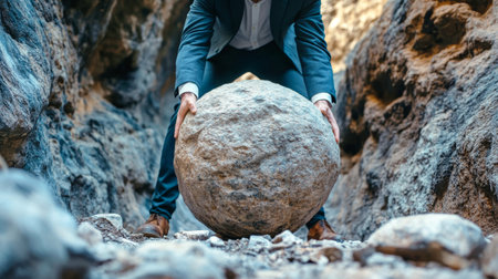 An adult man dressed in business attire pushes a heavy stone ball inside a dark cave, symbolizing struggle and determination in a unique business setting.