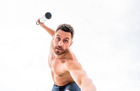 Victory requires payment in advance. Bandit aggression anger. Muscular man fighting. Violence and attack. Street fight. Attack and defence. Get ready attack. Man with baseball bat. Hooligan hits bat